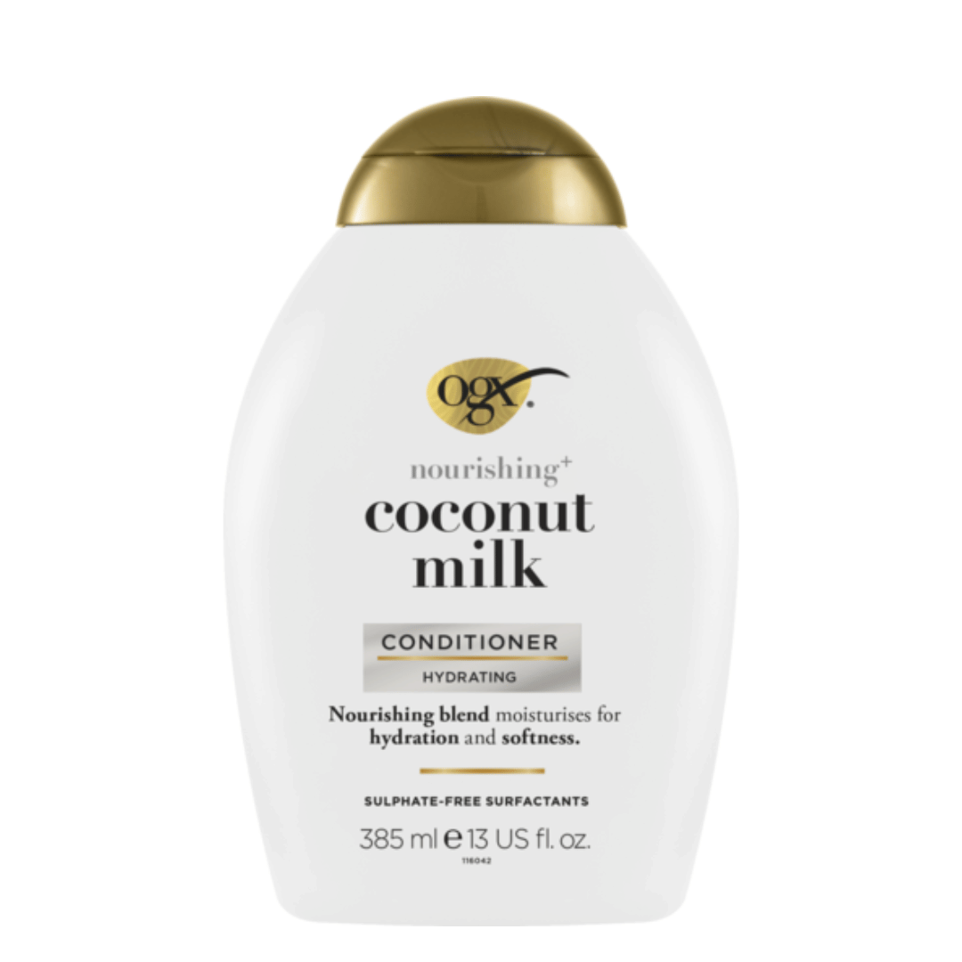 After shampooing with OGX Nourishing + Coconut Milk Shampoo, apply conditioner generously to hair, focusing on mid-lengths to ends.