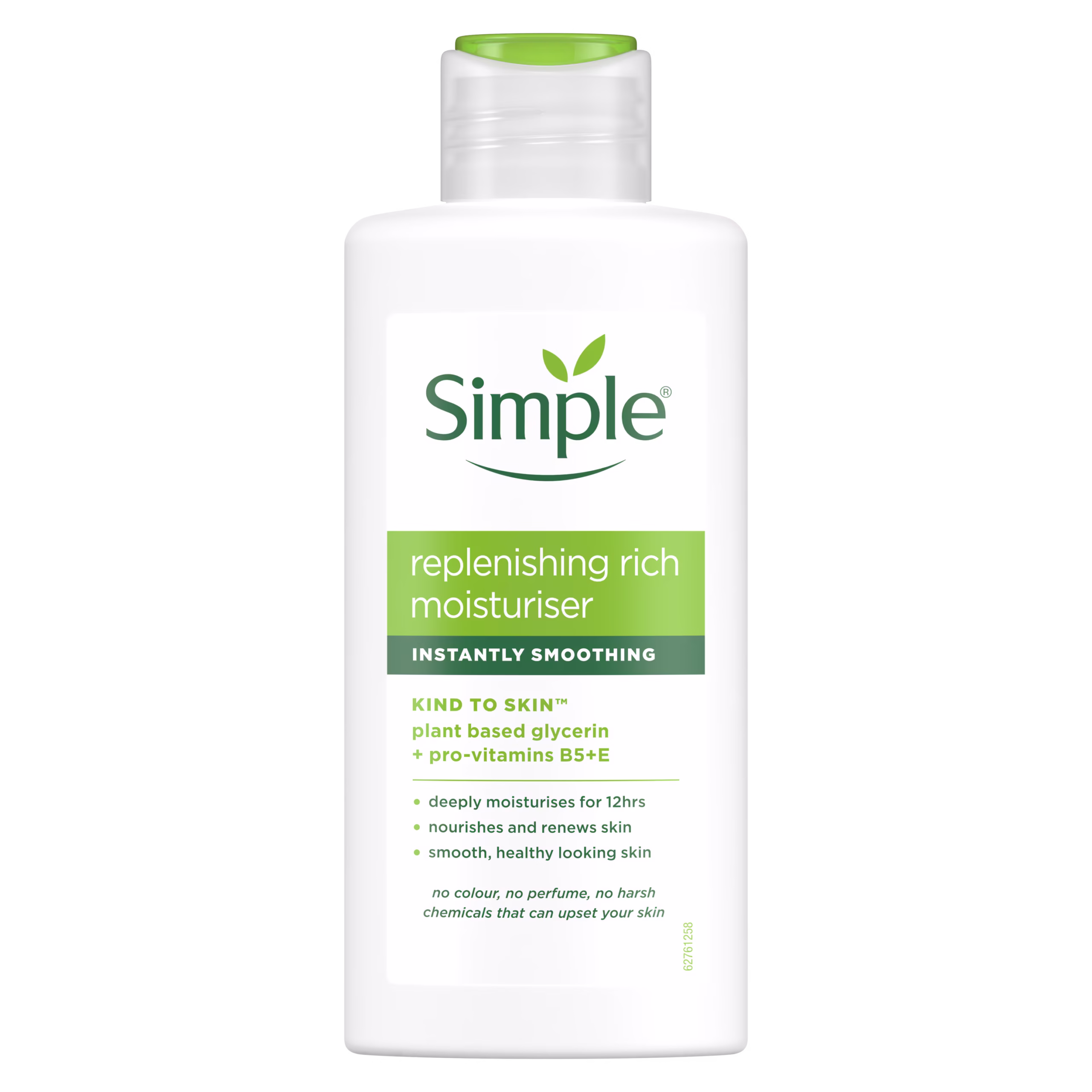 Simple Replenishing Rich Moisturiser is a vitamin-rich formula designed to smooth and soften dry skin. Made with pure, gentle ingredients, it is ideal for sensitive skin and free from artificial colors, perfumes, and harsh chemicals that can irritate. Dermatologically tested, hypoallergenic, and non-comedogenic, this moisturizer keeps skin comfortable and hydrated all day. The product comes in eco-friendly packaging.